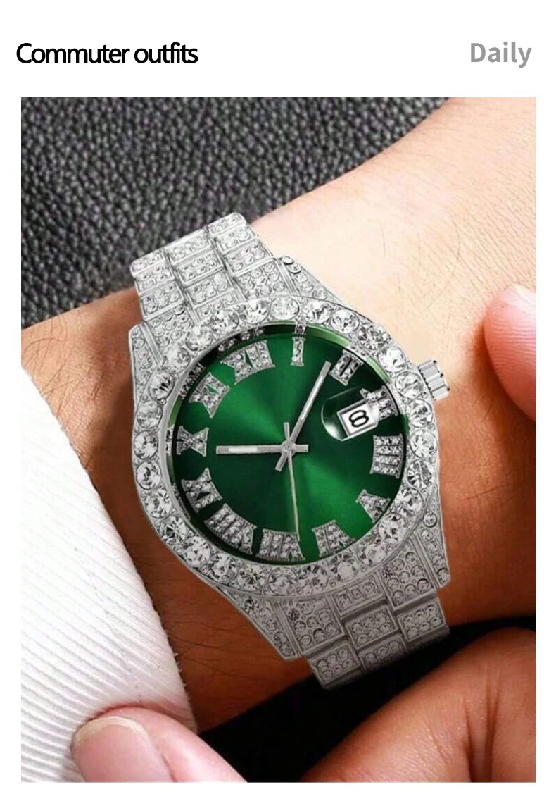 Make a bold statement with this premium three-piece jewelry set designed for the discerning man. The centerpiece features an iced-out watch with a sparkling diamond dial that catches light from every angle, paired with a matching nugget bracelet and chain necklace. Crafted in lustrous 14k gold tone and silver finishes, each piece showcases meticulous detailing and substantial weight for authentic presence. Perfect for elevating everyday style or commanding attention at special occasions, this coordinated set delivers luxury appeal without compromise. Ideal for those who appreciate quality craftsmanship and timeless sophistication.