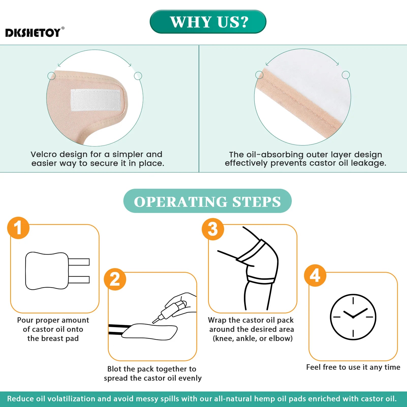 Versatile and Adjustable: The anti-oil leak elastic strap and buckle on our Castor Oil Pack provide a secure and adjustable fit, allowing you to customize the level of compression and support. It can be used for knee pain, liver detox aid, and even as a sleep aid.